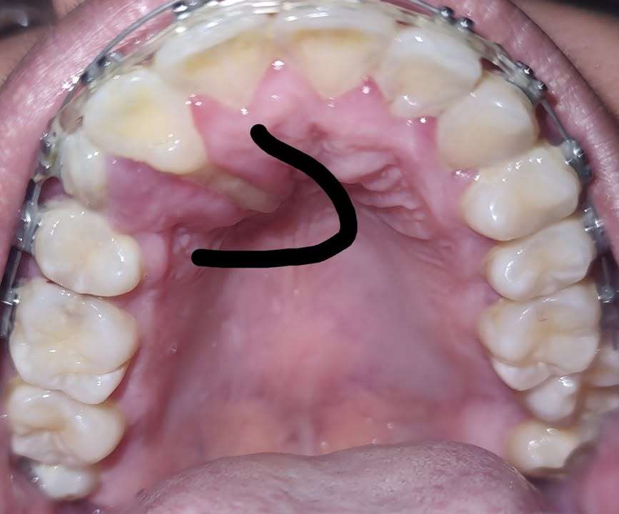 右上側切歯の歯根が口蓋側から露出している。